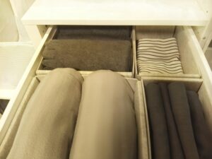 セーターなど伸びる衣服や下着&靴下は畳んで引出し収納にセットするもの。
