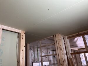 断熱工事と合わせて、屋根裏の妻壁(三角部分の所)に石こうボードを貼り、その後は内装を作る造作工事が始まります。