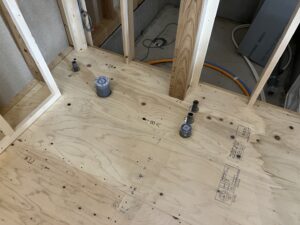洗濯機やトイレ・キッチン・手洗い・お風呂等の配管を床下から壁内や床面に立ち上げて器具付けの準備完了です。