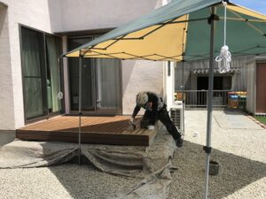 サンダーを掛けている間に、オーナー様がタープを立ててくださり少し影が出来ました。